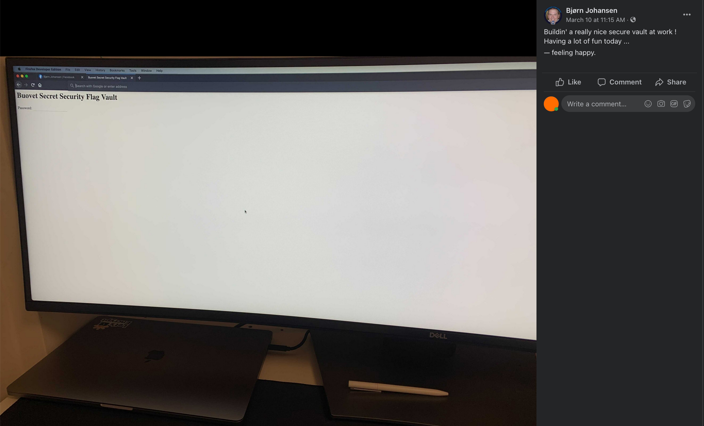 Bjørn Johansen i Buovet har stukket av med flagget vårt, ryktene sier han har gjemt det på en passordbeskyttet webapplikasjon han har skrevet selv. Kan du finne det for oss?
