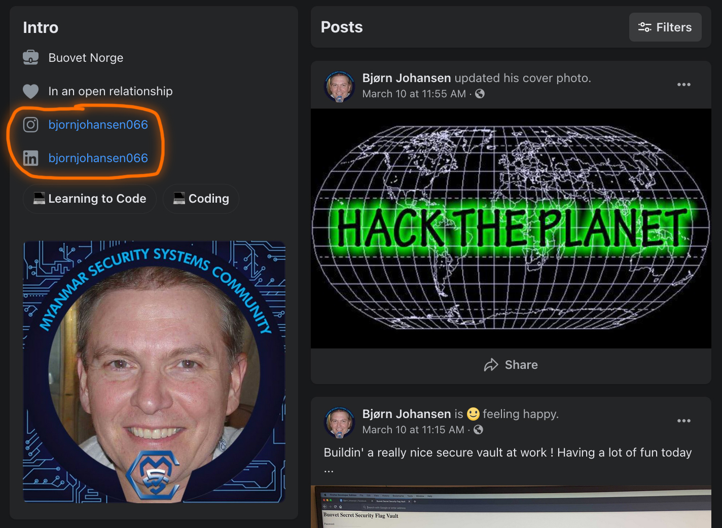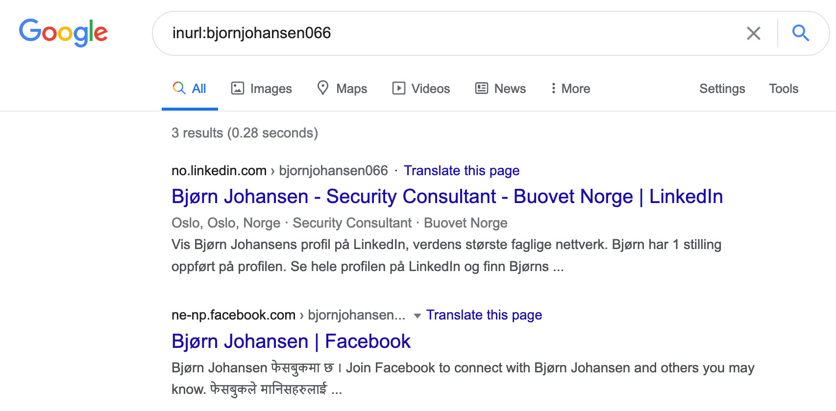 Using that nickname in the HTML comment, we can search for it on various social media, or just Google him, preferably using the dork inurl:bjornjohansen066 to find every indexed URL that contains the word “bjornjohansen066”.