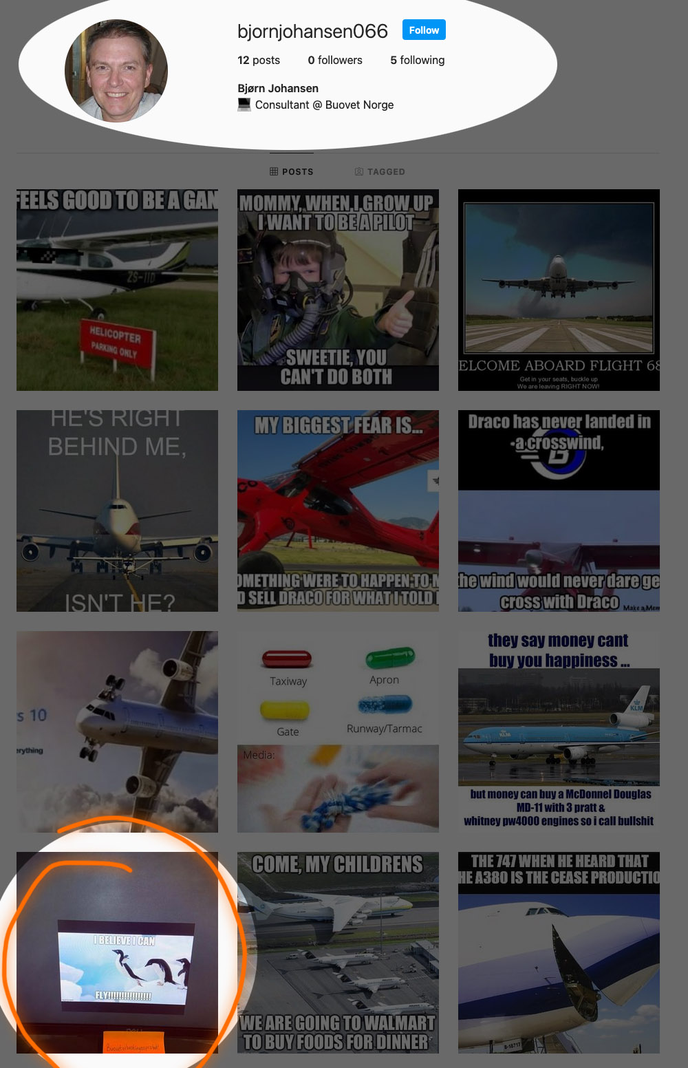 On Instagram, Mr. Johansen uses the same profile picture, as well as writes out his workplace. He posted a lot of silly photos, mainly aviation-related, but there’s one photo that actually stands out.