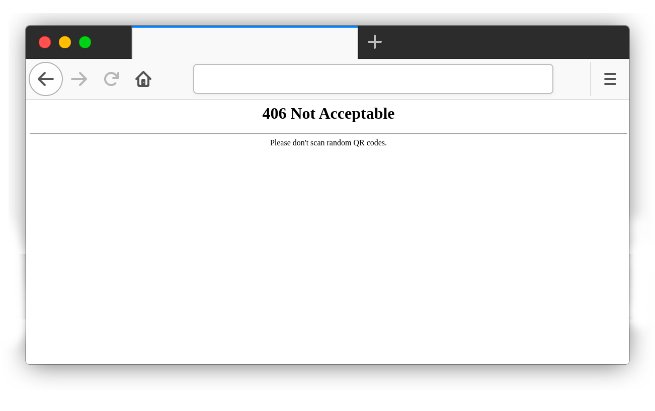 Upon visiting the website, one was presented with a custom HTTP Error 406 - Not Acceptable page telling you to not scan random QR codes you find.